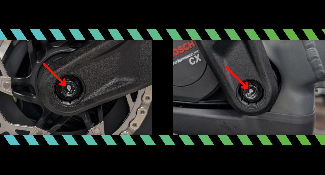 Falls Ihr Modell in der Liste aufgeführt ist, prüfen Sie, ob die Kurbelverschraubung Ihres Bikes mit einer Markierung wie unten dargestellt versehen ist. Falls ja, ist Ihr Bike bereits geprüft und sicher!